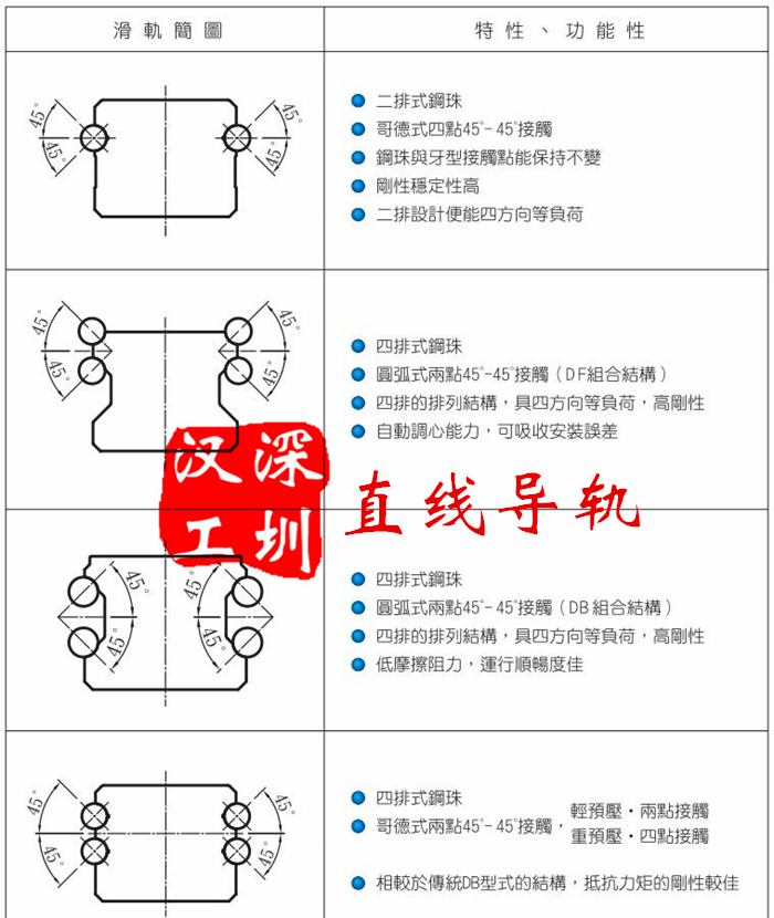 運用四列式圓弧溝槽,配合四列鋼珠等45度之接觸角度,讓鋼珠達到理想的兩點接觸構(gòu)造,能承受來自上下和左右方向的負荷;在必要時更可施加預(yù)壓以提高剛性。